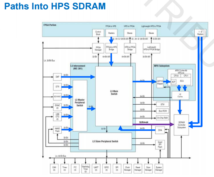 El ARM tiene canales de comunicación que son Master se llaman axi, los canales axi tienen un ancho de banda dependiendo del canal que se utilice.