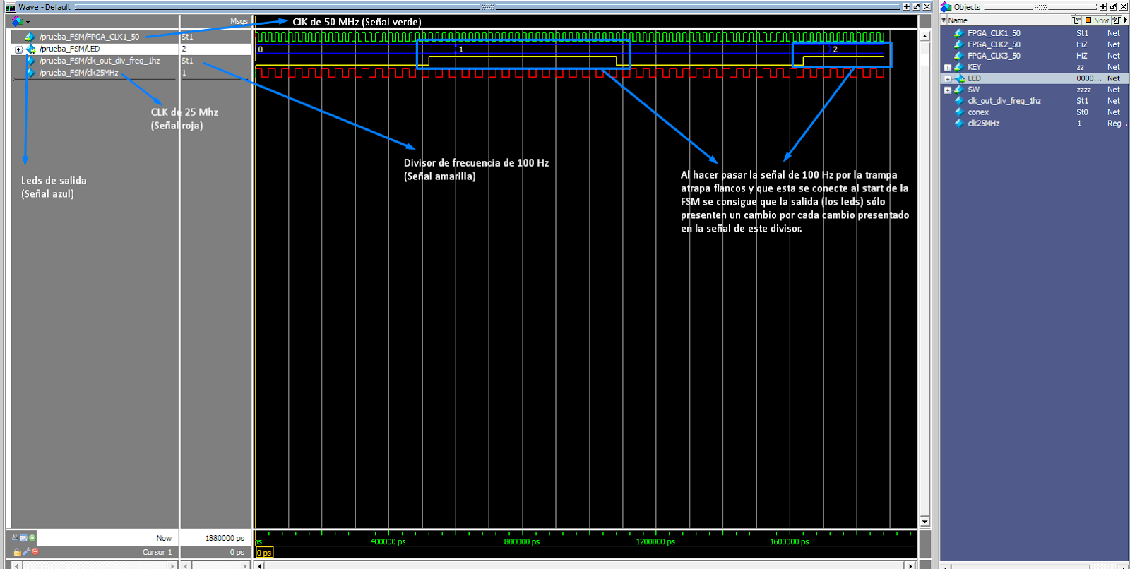 En la simulación se puede observar que la salida de la FSM (representada por los leds) cambia en más de una ocasión en cada flanco de la señal de su entrada
